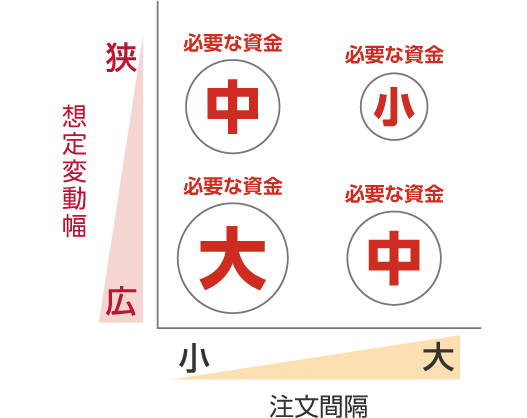 | 注文間隔の違いによる必要資金の比較(米ドル/円の場合) | ||